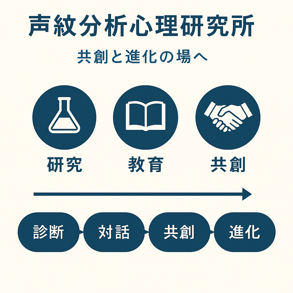 声紋分析心理研究所は、“声”を通じて人間の奥深さに触れ、共創と進化の道をひらく場です。診断や鑑定の枠を超え、「研究・教育・共創」を軸に、声紋を活用した新たな人間理解と個性がきれいにシンクロし交わる社会を目指しています。